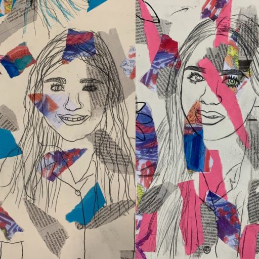 The background of our students artwork pieces have been created using collage with newspaper, coloured paper and printed designs. Students have torn the mixture of papers and placed the pieces in random compositions to create their own unique and colourful backgrounds.